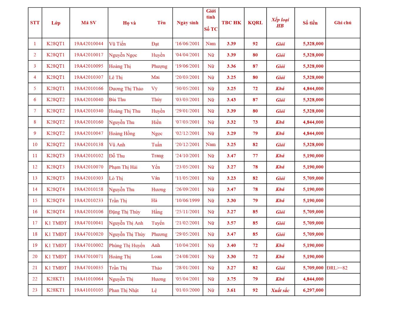Danh sách dự kiến đề nghị được xét cấp học bổng Khuyến khích học tập