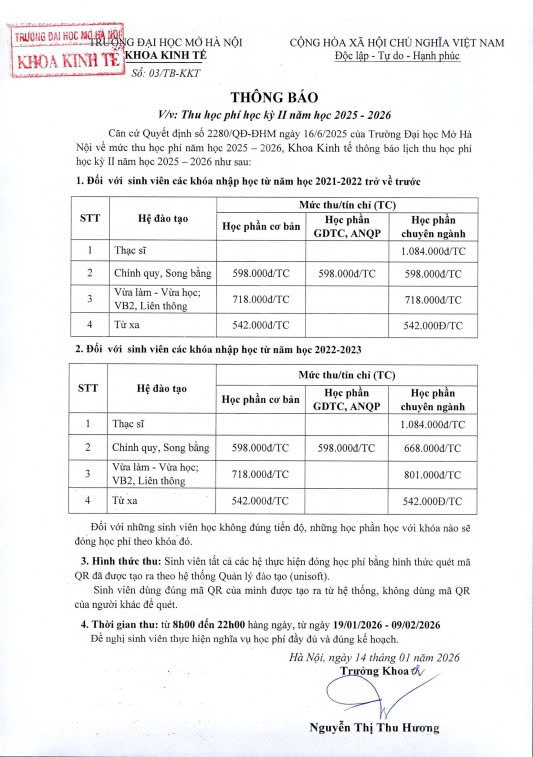 Thông báo thu học phí học kỳ 2 năm học 2025 - 2026
