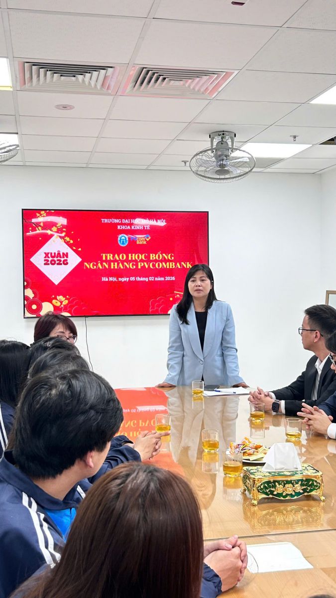 Phát biểu tại chương trình, TS. Nguyễn Thị Thu Hường - Phó Bí thư Chi bộ, Phó Trưởng Khoa Kinh tế nhấn mạnh, hoạt động trao học bổng không chỉ thể hiện sự quan tâm của Ban Lãnh đạo Khoa và doanh nghiệp đối với sinh viên mà còn góp phần lan tỏa giá trị nhân văn, khích lệ tinh thần vượt khó, vươn lên trong học tập của các em sinh viên. TS. Nguyễn Thị Thu Hường đồng thời gửi lời cảm ơn sâu sắc tới PVcomBank vì sự đồng hành bền bỉ cùng Khoa Kinh tế trong các hoạt động hỗ trợ sinh viên.