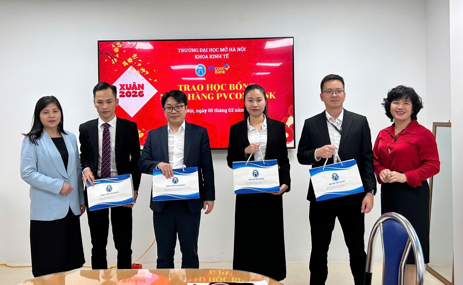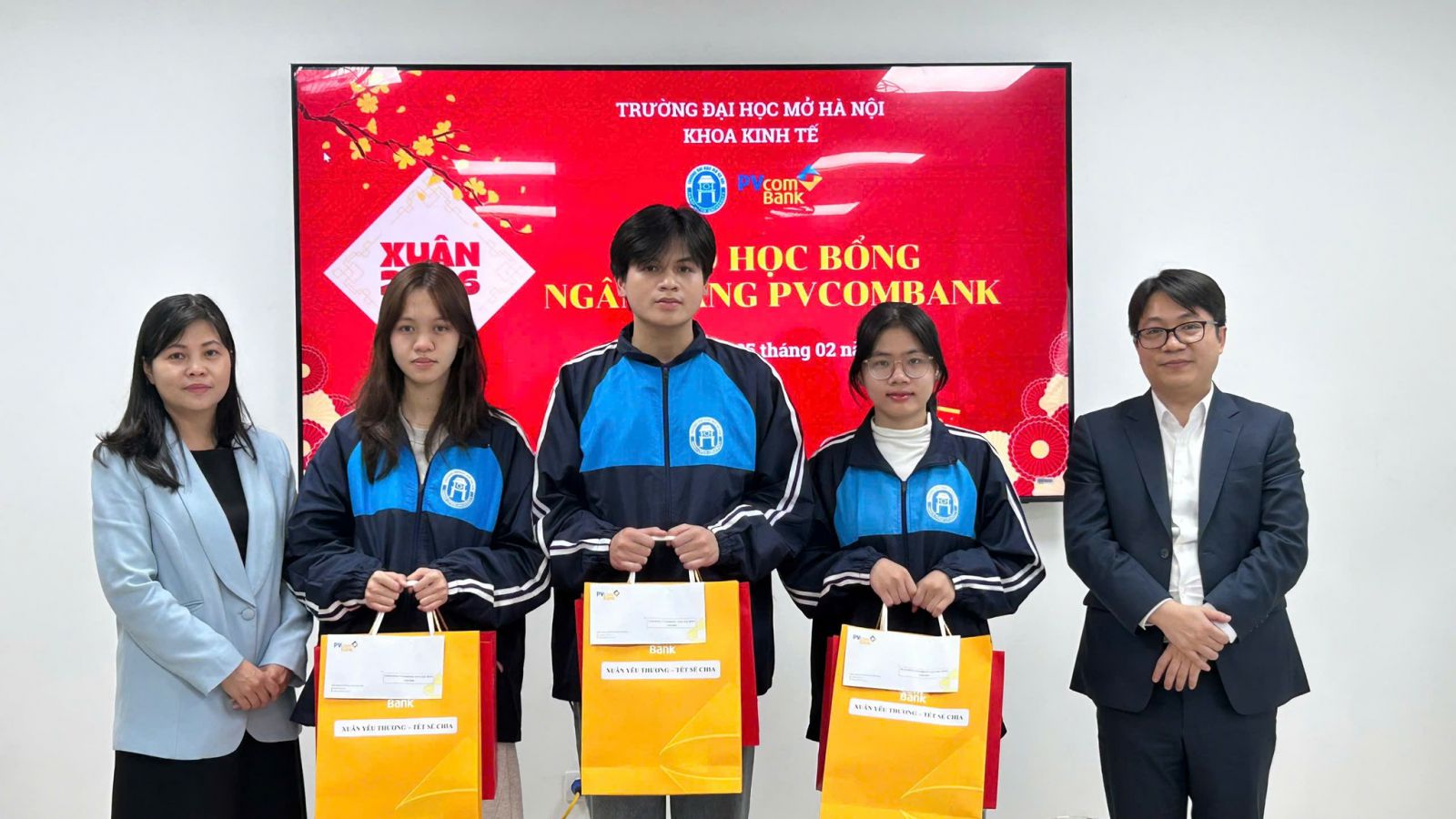 Nhằm chung tay hỗ trợ sinh viên có hoàn cảnh khó khăn, đồng thời lan tỏa tinh thần sẻ chia trong dịp Tết Nguyên đán, Khoa Kinh tế - Trường Đại học Mở Hà Nội phối hợp cùng Ngân hàng PVcomBank tổ chức Chương trình "Tết yêu thương - Xuân sẻ chia" trao học bổng trị giá 3 triệu đồng và quà Tết dành cho sinh viên có hoàn cảnh khó khăn của Khoa.