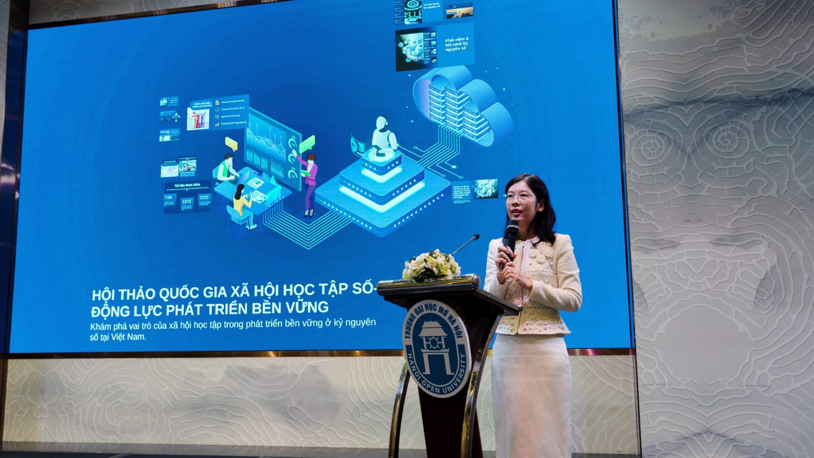 Phát biểu khai mạc hội thảo, PGS.TS Nguyễn Thị Nhung – Hiệu trưởng Trường Đại học Mở Hà Nội khẳng định: “Trong bối cảnh cuộc Cách mạng công nghiệp lần thứ tư đang tác động mạnh mẽ tới mọi lĩnh vực, việc xây dựng xã hội học tập số không chỉ là yêu cầu cấp thiết của ngành giáo dục mà còn là động lực để phát triển con người Việt Nam toàn diện, hướng tới mục tiêu phát triển bền vững.” PGS.TS Nguyễn Thị Nhung nhấn mạnh vai trò của Trường Đại học Mở Hà Nội và các đơn vị liên kết, đơn vị phối hợp trong giáo dục mở, học tập suốt đời và ứng dụng công nghệ số vào quản lý, giảng dạy, đánh giá người học- một trong những đơn vị tiên phong trong lĩnh vực đào tạo mở, học tập suốt đời và ứng dụng công nghệ số vào quản lý, giảng dạy, đánh giá người học. Nhà trường coi việc xây dựng mô hình “xã hội học tập số” là nhiệm vụ trọng tâm, phù hợp với định hướng của Bộ Giáo dục và Đào tạo trong chiến lược chuyển đổi số toàn ngành.